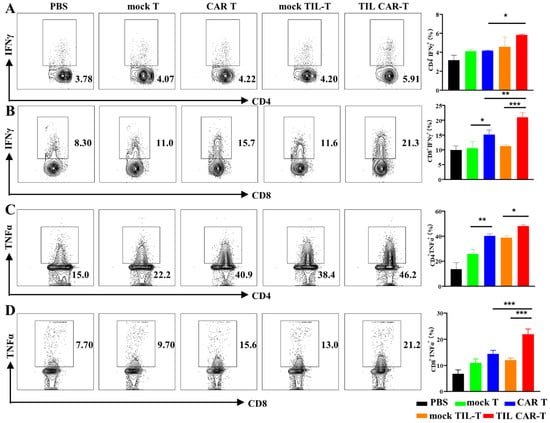 TIL CAR-T enhanced the cytotoxicity of splenic T cells of the tumor-bearing mice. The frequency of subtype T cells in the spleen was detected by FACS. (A) The percentage of IFNγ+CD4+ T. (B) The percentage of IFNγ+CD8+ T. (C) The percentage of TNFα+CD4+ T. (D) The percentage of TNFα+CD8+ T (n = 3, * p < 0.05; ** p < 0.01; *** p < 0.001).