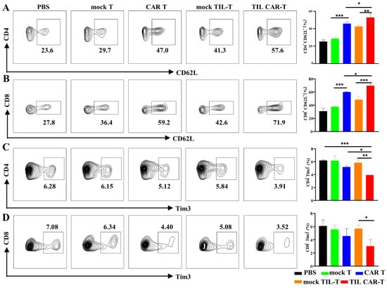 An increasing number of memory T stem cells, especially long-lived memory CD8+ T cells, can prevent relapse and prolong the survival time of mice. To determine the changes in memory T cells, we detected CD62L expression in splenic T cells. With CAR T administration, the frequency of CD62L+CD4+ T cells increased from 25.2 ± 1.97% to 45.67 ± 2.22%. However, the positive rate of CD62L after TIL CAR-T cell delivery was as high as 52.97 ± 4.17%. The expression of CD62L+ in CD8+ T cells was 30.77 ± 4.55% in the PBS group, 59.73 ± 0.47% in the CAR T group, and 69.43 ± 2.28% in the TIL CAR-T group (Figure 6A,B).
