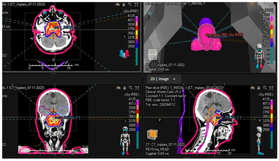 The PBRT characteristics are described in detail in Table 1. Treatment was prescribed in five fractions, administered in consecutive days, with a weekend in-between. Most of the patients were treated using apertures to optimize dose gradient; two apertures were used in two different beams, per plan. All the plans complied with mandatory dose constraints, temporal lobe, and cochlea dose constraints, at least in the nominal scenario. It has not been necessary to create adaptive planes during any treatment course. In addition, Figure 1 shows the dosimetry of a patient with a skull base chordoma who received adjuvant hypofractionated PBRT.