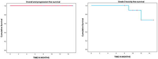 For the descriptive analysis, frequency tables were created on qualitative variables. In quantitative variables, mean, range, and median were described. For the analysis of survival, the date of diagnosis and PBRT treatment to the date of appearance of the corresponding event or the date of the last follow-up was collected. Overall survival (OS), progression-free survival (PFS), and grade 3 toxicity-free survival were estimated using the Kaplan–Meier method. The confidence interval (CI) was designated as 95%.