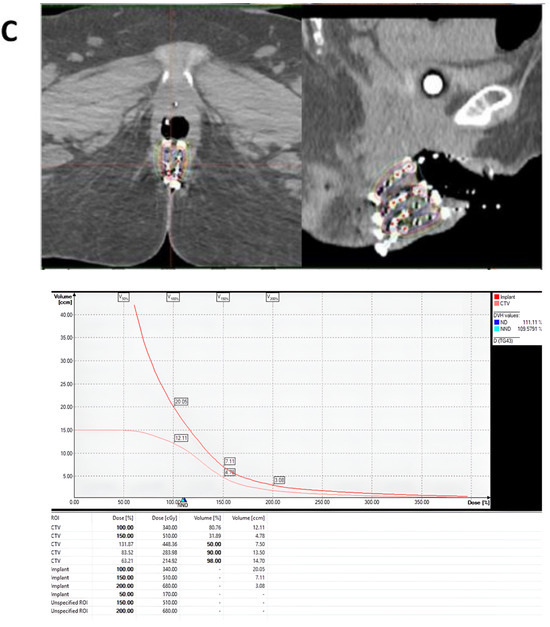 Compared to EBRT, BT has the radiobiological potential to improve the dose to the target volume and minimize the dose to organs at risk. It is a more reproducible technique and covers the skin better than EBRT, without the need for a bolus. The rapid dose fall-off allows for the sparing of healthy organs such as the urethra and anus, which can be difficult to spare. A higher RT total dose on the lesion site may lead to better local control and a lower risk of disease progression [11,16]. Hypofractionated-accelerated treatment can also be performed using BT.