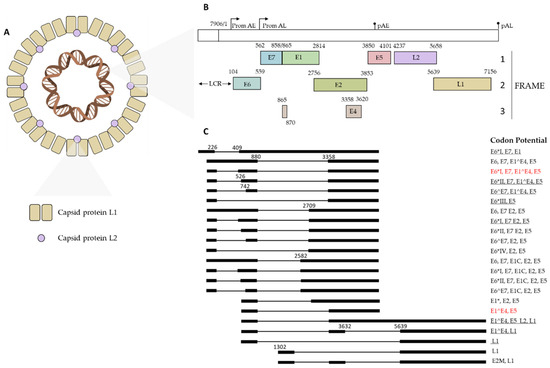 HPV features. (A) Structure of the capsid. (B) The genome is represented in a linear fashion with the positions of the viral early (PromAE) and late (PromAL) promoters, early (pAE) and late (pAL) polyadenylation signals; below are the predicted viral ORFs with the positions of the nucleotides in the viral genome. (C) Coding potentials are illustrated for each transcription event; the most abundant transcripts (>60%) are indicated in red, and the less abundant ones are underlined (<5%).