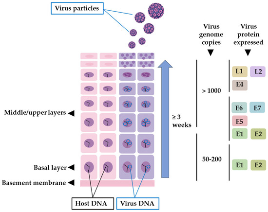 Within the nucleus, L2 localizes viral genomes within PML nuclear bodies, promoting early gene expression. There is evidence that strongly indicates that the RNA responsible for encoding E1 and E2 stands as the earliest detectable RNA species. These two proteins assume a foundational role in facilitating the commencement of genome replication. The rapid expression of the viral transcription factor E2 is justified by its important role as a transcriptional regulator [28,79]. This process is crucial in regulating the precise operations of the viral early promoter, which, in turn, governs the expression of the E6 and E7 regulatory proteins, essential for supporting the continued viability of infected cells [80]. In the initial replication phase of the incoming HPV genome, roughly 50–100 episomal copies are generated within each nucleus [47]. These copies are distributed uniformly among daughter cells by forming attachments to the host cell chromosomes via E2 bound to the viral LCR and chromatin-binding proteins [81]. Cells of this nature are primed for differentiation, preparing to ascend to the upper layers of the epithelium, carrying the viral genomes with them and ensuring that the presence of the virus persists throughout their migration [82]. From in situ hybridization research, it was observed that elevated levels of mRNA coding for E6 and E7 oncoproteins were present in the middle layers of epithelial tissue [83,84]. As one moved towards the upper layers of the epithelium, these levels gradually decreased [85]. These oncoproteins play a crucial role in inhibiting keratinocyte differentiation, thus promoting the proliferation of epithelial cells involved in DNA replication [48]. E4 and E5 are expressed in the middle-upper layers. E4 serves a critical function in mature keratinocytes, facilitating the enhancement of the viral genome amplification process. Additionally, it plays an important role in the latter stages of the virus replication cycle, potentially involved in the restructuring of cytokeratin filaments, rendering the cells more fragile and facilitating the release of viral offspring. Moreover, E4 functions as a transcriptional inducer for late genes [37]. Meanwhile, E5 oversees cell division pathways and acts as a protective shield for the virus against the host’s immune response [86]. Research has revealed that multiple miRNAs possess the capability to regulate the expression of viral genes. For instance, Gunasekharan et al. conducted a study illustrating how miR-145 effectively targets specific sequences within the E1 and E2 regions of HPV31 genes. This precise targeting results in the depletion of essential viral replication factors, ultimately leading to a diminished amplification of the viral genome [87].