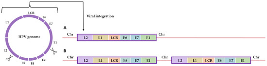 Integration of HPV into human cells: (A) a single copy of the viral genome integrates; (B) clonal integration event of the viral genome.