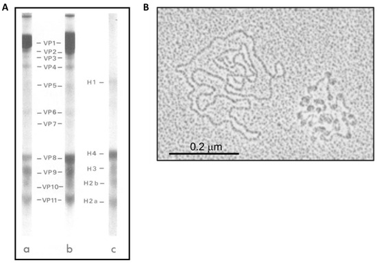 HPV genome organization. (A) SDS-polyacrilamide cylindrical gel electrophoresis and gradient slab gel electrophoresis of SDS-dissociated papillomaviruses. Samples included highly purified BPV (a), HPV (b) proteins, and calf liver histones (c); (B) electron microscopy of HPV genomes showed naked HPV DNA molecules (left) and nucleoprotein-DNA complexes (right) [116]. (viral protein 1–11, VP 1–11; H1, histone 1; H2A, histone 2A; H2B, histone 2B; H3, histone 3; H4, and histone 4) [125].
