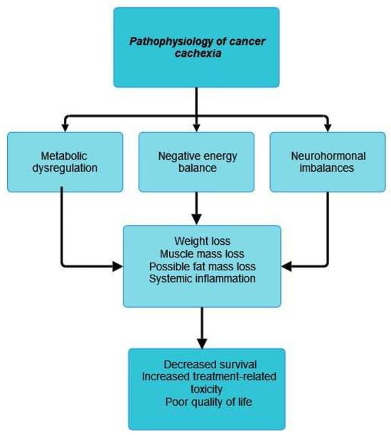 The interaction between the tumor and the body’s tissues leads to a systemic inflammatory response. Systemic inflammation is associated with negative nitrogen balance, increased energy consumption, and weight loss [28]. A systemic inflammatory response leads to a progressive impairment of the functional and nutritional status of the patient, a poor prognosis, and decreased survival of cachectic cancer patients [29]. The activation of the humoral immune system and the secretion of tumor cell-derived cytokines, such as tumor necrosis factor-alpha (TNF alpha), interferon-γ (IFN-γ), interleukin-1β (IL-1β), and interleukin-6 (IL-6) are part of the pathophysiology of cancer-related cachexia. Immune cells such as neutrophils, macrophages, T-cells, and bone marrow-derived suppressor cells are also involved in cancer cachexia pathogenesis [1,3].