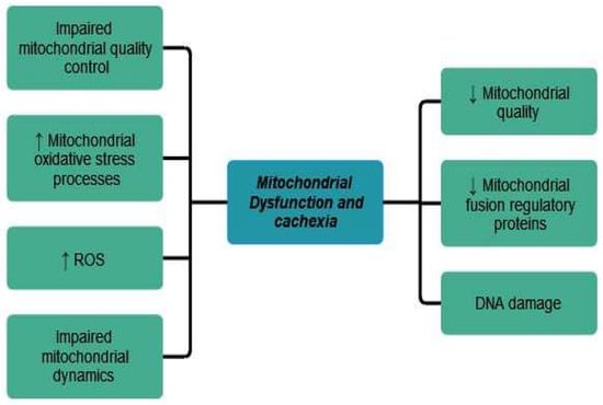 Mitochondrial changes during cancer cachexia are still understudied. According to Lim et al., mitochondrial oxidative stress processes and reactive oxygen species (ROS) generation precede the development of cancer cachexia in tumor-bearing mice. There is impaired mitochondrial dynamics, autophagy, quality control, and reduced content of mitochondrial fusion regulatory proteins [1]. The role of mitochondria in cancer cachexia pathogenesis was also discussed by Tournadre et al. Mitochondrial alterations lead to poor mitochondrial quality and activity, malfunction of mitochondrial metabolism and oxidative phosphorylation processes, DNA damage, and altered mitochondrial dynamics [38].