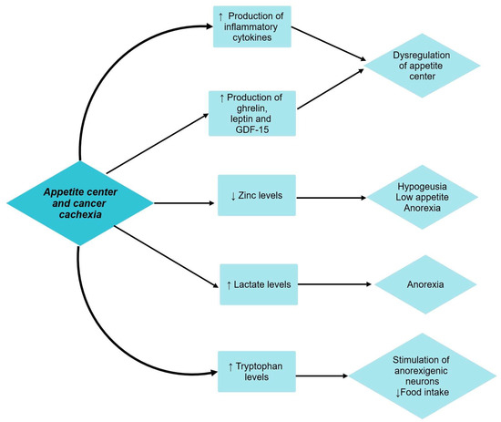 In cancer patients, the production of inflammatory cytokines dysregulates the balance of the appetite center. Substances like leptin, ghrelin, and growth differentiation factor-15 (GDF-15) are also involved [10]. Cancer alters zinc homeostasis as a consequence of the acute phase response to inflammatory cytokine activity. Low zinc levels are associated with hypogeusia, thus further contributing to low food appetite and anorexia in cancer patients [38]. Lactate is also involved in the pathophysiological mechanism of cancer cachexia. Increased levels of lactate are found in cachectic patients, lactate being an anorexic agent. In addition, cachectic patients also experience high plasmatic levels of tryptophan, the precursor of serotonin. Serotonin negatively influences food intake by activating anorexigenic neurons like pro-opiomelanocortin (POMC) and cocaine- and amphetamine-regulated transcript (CART) in the melanocortin system [44].