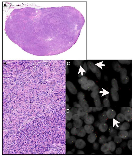 Metaplastic thymomas are very rare neoplasms that only occur in the thymus [25]. They are characterized by a biphasic morphology including a darker component of ovoid, bland appearing epithelial cells with inconspicuous nucleoli and a paler component of fibroblast-like spindle cells with ample pale cytoplasm (Figure 2A,B). The two components are either clearly separated or merged. Mitotic activity is not increased, and necrosis is not identified. The diagnosis in general is based on morphology. Keratin AE1/AE3 highlights the epithelial component and may or may not stain the spindle cell component. P40 marks only the epithelial component and is negative in the spindle cell component. MAML2 rearrangements have been identified in 77 to 100% of these tumors (Figure 2C,D) [5,6,7,8]. In metaplastic thymomas the fusion partner is YAP1, resulting in YAP1::MAML2 fusion genes fusing exon 1 or exons 1–5 on YAP1 with exons 2–5 on MAML2 [5,6]. However, fluorescence in situ hybridization (FISH) studies for MAML2 rearrangements are usually not necessary for the diagnosis. Moreover, the split signal that results from an intrachromosomal inversion on chromosome 11 in the YAP1::MAML2 fusion using a break apart FISH may be subtle and can be missed [7]. Recently, expression of YAP1-C terminus by immunohistochemistry has been shown to be highly sensitive and specific for metaplastic thymoma when evaluated in the context of other TET, including type A, AB, B1, B2, and B3 thymomas, and thymic carcinomas [7].