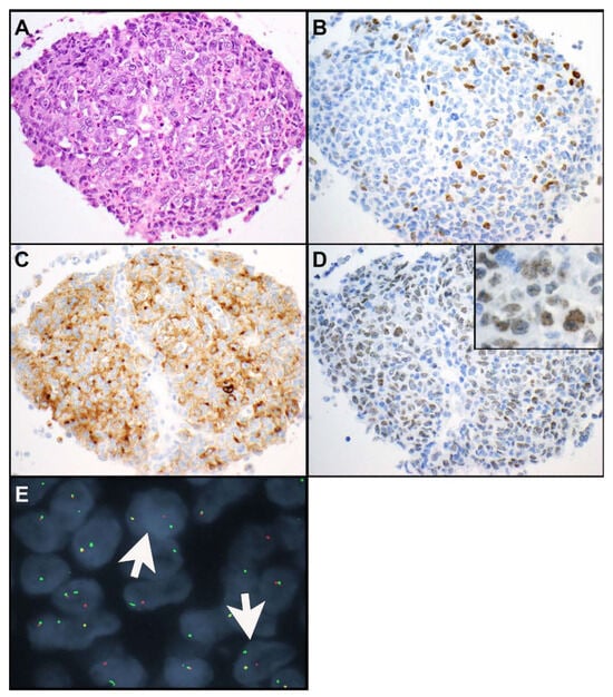 NUT protein is encoded by NUTM1. The most common molecular alteration, found in 70% to 78% of all NUT carcinomas, is a t(15;19) (q14;p13.1) translocation resulting in the BRD4::NUTM1 fusion oncogene [43,45,46]. Bromodomain containing protein 4 (BRD4) is a double bromodomain-containing gene which is involved in the regulation of cell cycle progression [17]. Less common translocations include BRD3::NUTM1 and NSD3::NUTM1 [43,45]. Other fusion partners of NTM1 are CHRM5, ZNF532, and ZNF592 [35,43,45]. NUTM1 rearrangements result in the expression of NUT protein which is normally only expressed in spermatids [47]. Immunohistochemistry for NUT reveals the abovementioned nuclear speckled staining pattern which is 100% specific and highly (87%) sensitive for NUT carcinoma in non-germ cell tumors [36,38]. Confirmatory ancillary tests are not necessary for the diagnosis. However, NUT immunohistochemistry may occasionally be negative. If in doubt, additional molecular or cytogenetic tests, such as next-generation sequencing (NGS), reverse transcription polymerase chain reaction (RT-PCR) for NUTM1::BRD4, fluorescence in situ hybridization (FISH) for NUTM1 rearrangement (Figure 4E), or karyotyping, should be performed. The karyotype of NUT carcinomas is usually simple, with the only aberration being the rearrangement involving the NUTM1 gene [46]. Besides NUTM1 rearrangements, no other molecular alterations have been reported in NUT carcinomas [45].