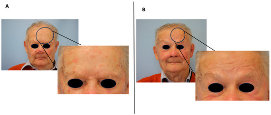 Clinical improvement of classic AK after three months of photodynamic therapy treatment (PDT). (A) Before PDT, (B) 3 months after PDT.