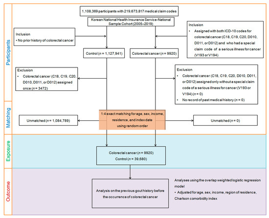 A nested case-control study design was considered appropriate to examine the relationship between subjects’ medical histories, presence or absence of exposure, and outcomes. The KNHIS-NSC database follows the International Classification of Diseases, 10th revision (ICD-10), codes for the standardization of disease diagnoses and organization of healthcare information. During this study, participants newly diagnosed with CRC between 2005 and 2019 (n = 9920) were initially selected based on their diagnosis of CRC (ICD-10 codes: C18, C19, C20, D010, D011, and D012) and the presence of a special claims code indicating severe cancer (V193 or V194). A special claims code indicating severe cancer-related illness that allows for payment reductions for such patients has been implemented by the National Healthcare Service since 2005. Individuals not diagnosed with CRC between 2005 and 2019 were included in the control group (n = 1,127,941). Individuals in the control group who had been diagnosed with CRC even once (n = 3472) were excluded from the analysis. Individuals in the CRC group whose ICD-10 diagnostic code for CRC was assigned without a special claims code for severe illness or cancer or without a medical history were excluded.