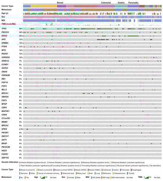 Statistical analysis was performed with JMP Pro 14 (SAS Institute Inc., Cary, NC, USA). The oncoprint in Figure 1 was generated by Oncoprinter in cBioportal [19,20]. The open genetic dataset of advanced cancer patients who received immunotherapy was also quoted from cBioportal and was originally reported by Samstein et al., from Memorial Sloan Kettering Cancer Center (MSK IMPACT dataset) [21].