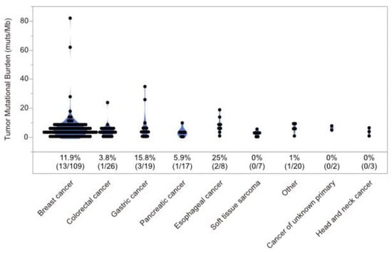 Distribution of tumor mutational burden. Percentages represent the ratio of cases with tumor mutational burden greater than 10 muts/Mb in coding regions.