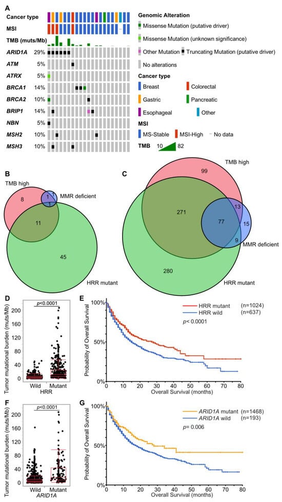 To confirm that HRR gene alterations are associated with TMB-high, another large data set from the cBioportal dataset was examined [19,20,21]. The MSK-IMPACT dataset comprises 1662 patients who received immunotherapy. Among them, 1256 received anti-PD-1 or PD-L1, 146 received anti-CTLA-4, and 260 received a combination of anti-CTLA-4 and anti-PD-1/PD-L1 therapies. This dataset from MSK-IMPACT suggests that a considerable proportion of patients with TMB-high possessed HRR gene alterations (Figure 3C). Most patients with TMB-high in our dataset did not receive immunotherapy due to their cancer types; therefore, the association between HRR gene alterations and survival on immunotherapy was examined in the MSK-IMPACT dataset. Patients with HRR-mutants (HRRm) had higher TMB and showed significantly longer survival (Figure 3D,E). In the present study, ARID1A mutant cases tend to show TMB-high. Focusing on ARID1A among the HRR genes, ARID1A mutants also had higher TMB and showed longer survival in the MSK-IMPACT dataset (Figure 3F,G).