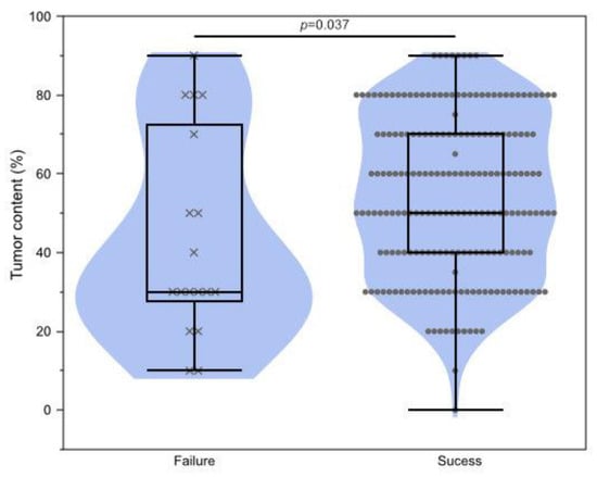 Next, clinical factors affecting sequencing failure were investigated. Eighteen cases in the present dataset failed testing. The sampling method and tumor site were not associated with testing success or failure (resection vs. biopsy, p = 0.60; primary vs. metastasis, p = 0.76). Cases on neoadjuvant chemotherapy before sampling tended to fail sequencing, but not significantly (p = 0.22) (Table 4). A low percentage of tumor cell nuclei caused significant sequencing failure (p = 0.037, Figure 4).