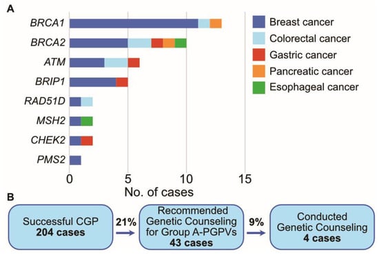Although the primary objective of CGP is the identification of biomarkers to guide genotype-matched therapy, tumor genomic testing may also reveal germline gene alterations that are linked to heritable cancer susceptibility and other conditions. These potentially heritable gene alterations found in tumor-only sequencing tests are called “presumed germline pathogenic variants (PGPVs)”, and their origin should be confirmed thorough subsequent germline testing [23]. The reporting of PGPVs and the referral to genetic counseling is one of the important tasks of the molecular tumor board, called the “expert panel” in Japan. Our institute originally defined a gene list of recommendations for the reporting of PGPVs. These gene lists were based on ACMG and ESMO recommendations [24]. Genes with a heritable predisposition to cancer were divided into two categories, Group A and Group B (Table 5). We recommend genetic counseling for patients with group A genes alterations regardless of family history or their own history of cancer, because it is highly suspected that group A gene alterations derive from germline alterations. According to ESMO recommendations, these gene alterations in tumors indicate that they originated from germline alterations with over 10% probability, that is, group A gene alterations have a high germline conversion rate. On the other hand, group B gene alterations can originate from germline alterations, but the probability is relatively low. When patients harboring group B gene alterations in tumors have a certain personal history or family history, the germline conversion rate can exceed 10%. Therefore, we decide whether to recommend genetic counseling for patients with group B gene alterations considering their history. In the present study, 43 cases had Group A gene alterations, and genetic counseling was recommended to them. BRCA1 alteration was the most frequent gene alteration among them (Figure 5). However, only four cases had genetic counseling. The others did not have genetic counseling despite physicians’ recommendations.