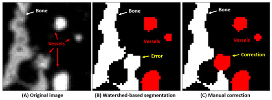 Training data set generation for bone and blood vessels. (A) the original image. (B) The image is first segmented using a watershed-based algorithm. (C) This segmentation is then improved manually to yield as good training data as possible.