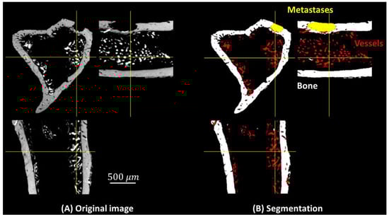 Imaging experiments performed at the European Synchrotron Radiation Facility, Grenoble, France, on the ID19 beamline within this study have been previously described in detail [7,22]. In this study, we selected a VOI (volume of interest, ) to segment bone, blood vessels, and metastases (voxel size: 3.5 µm).