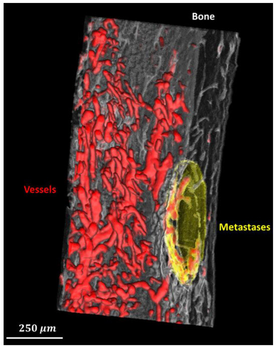 Breast cancer is common in women worldwide, and bone metastasis is one of the most dangerous consequences of breast cancer. Breast cancer bone metastases can lead to poor prognosis and result in the death of patients [1,2,3]. Vessel development is believed to play a major role in the development of metastases [4,5]. Unfortunately, in the bone metastatic process, the mechanism of bone vasculature in response to tumor invasion is still poorly known at the three-dimensional (3D) organ level [6]. Thus, the quantitative analysis of bone, blood vessels, and metastases is required [7]. In particular, few studies have investigated the local features of blood vessels around metastases so far.