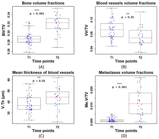 When analyzing the bone, we found a significant increase in the BV/TV (p < 0.001) at T2 (Figure 6A). With regard to the blood vessels, at T2, VV/TV was significantly lower (p < 0.01) and V.Th was significantly higher (p < 0.01) than at T1 (Figure 6B,C). This is possibly due to the fact that the mice were of a young age (T1) and growing fast (T2). Specifically, the lower VV/TV at T2 might be mainly due to the large increase of TV. In addition, the Me.V/TV was significantly higher (p < 0.001) at T2 (Figure 6D). This is due to mice developing bone metastases on average 18 days after tumor cell inoculation. The lower metastases volume measured at T1 is therefore expected and in line with the previous study [6].