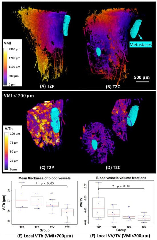 The previous measurements are global parameters in the complete ROI. To quantify the local features of blood vessels around metastases, we first measured the VMI and generated 3D mappings to describe the local distance from each point in the blood vessel compartment to the metastases compartment (Figure 7A,B). We then selected different VOIs (volume of interests: VMI < 300 µm, VMI < 700 µm, and VMI < 1000 µm) to quantify the local blood vessels. However, we found that the VOI (VMI < 300 µm) is too close to the metastases to extract enough blood vessel information to study. As for the VOI (VMI < 1000 µm), it might be more like global features rather than local features in some samples. Therefore, the VOI (VMI < 700 µm) was finally selected to investigate the local V.Th and VV/TV of blood vessels around metastases, as shown in Figure 7C–F.
