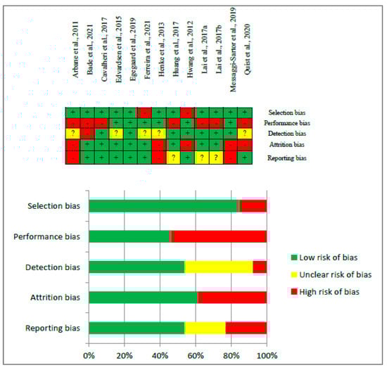 - Higgins, J.P.T.; Savović, J.; Page, M.J.; Elbers, R.G.; Sterne, J.A.C. Assessing Risk of Bias in a Randomized Trial. In Cochrane Handbook for Systematic Reviews of Interventions; John Wiley and Sons: Chichester, UK, 2019; pp. 205–228. [Google Scholar] [CrossRef]