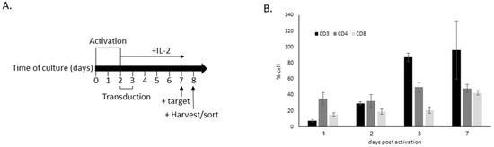 The production process of CAR T, and lymphocytes characterization. (A) CAR T production and activation timeline. Time points of activation of the cells with anti-CD3/CD28, CAR transduction, incubation with IL-2, addition of target cells and sorting/harvesting of the experiments are indicated. The average transduction percentage was 32.56% on day 7 (±2.98%, n = 3) (B) Percentage of cells expressing CD3, CD4 and CD8 at indicated days post activation, analyzed via flow cytometry (αhCD3-APC, αhCD4-FITC, αhCD8-PB). The results are the average ± S.D. of three productions.