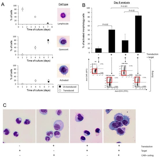 CAR-T cells exhibit activated morphology following specific target encounter in vitro. (A) percentage of cells exhibiting the lymphocytes (top), quiescent (middle) and activated (bottom) morphology at indicated days post activation of transduced (white circles) or un-transduced cultures (black circles). The results are the average ± S.D. of three productions. (B) percentage of cells exhibiting activated morphology following co-culture with CD19+ tumor cells. On day 7, transduced or un-transduced lymphocytes were co-culture in a 2:1 effector:target ratio with the CD19 expressing Raji cell line for 16 h. Cultures were then sorted, and all CD19 negative cells, which were sorted into CAR-positive or CAR-negative cells, were collected. Sorted cells (red squares) were fixed and stained and the morphology was determined via microscopic examination. The results are the average ± S.D. of three productions. p values are presented, with p < 0.05 considered significant. (C) Representative images of cells on day 8 of the experiment, with each treatment designated at the bottom.