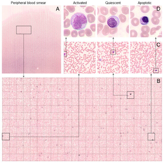 Scopio Labs FFM locates the optimal analysis area for each PBS, including the monolayer area and the feathered edge. On average, the monolayer part of the scan was 2.21 (range 1.22–4.45) cm2, equivalent to 1000 high-power fields (100× magnification). Then, Scopio Labs FFM performs as described [19]. Alternatively, PBSs were analyzed by the CellaVision DM1200 system (Lund, Sweden), according to the manufacturer’s instructions in a DSS mode.