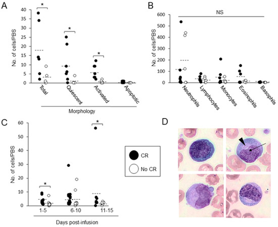 The average number of total CAR Ts, measured on D5 post-transfusion, was significantly (p = 0.018) higher in patients who obtained a complete response at day 30 post-CAR T, reaching 17.1 ± 13.7 cells/PBS (range 2–38) vs. 2.8 ± 3.4 cells/PBS (range 0–9) for patients who did not reach CR (Figure 5A). D5 quiescent cells and activated CAR Ts were particularly higher in patients attaining CR: 9.7 ± 9.6 cells/PBS (range 0–25) vs. 6.1 ± 3.8 cells/PBS (range 2–12), p = 0.023; and 0.8 ± 1.8 cells/PBS (range 0–4) vs. 0.6 ± 0.9 cells/PBS (range 0–2), p = 0.005, respectively (Figure 5A). No such correlation was found with other leukocyte types in the PBSs (Figure 5B). In line with that, the presence of CAR Ts in PB, assessed by measuring the average number of activated CAR Ts on D1–5 and D11–15, was also associated with increased CR rates; average numbers of activated morphology CAR Ts were 3.4 ± 2.9 cells/PBS (range 0.75–9, days 1–5), and 9.5 ± 18.9 cells/PBS (range 0–56, days 11–15) in patients with CR, vs. 2.2 ± 0.9 cells/PBS (range 0–7, days 1–5) and 1.5 ± 0.9 cells/PBS (range 0–3, days 11–15) in patients who did not reach CR (p = 0.03 and p = 0.04, respectively) (Figure 5C). The activated morphology CAR Ts, measured on day 5, were large cells with abundant basophilic cytoplasm and reticulated nucleus, with (Figure 5D, arrow) or without nucleoli, and evident perinuclear hallow representing developed Golgi in some of the cells (Figure 5D, arrowhead). As expected, disease burden was also associated with the outcome; patients entering CAR T therapy with responsive disease (n = 17) had a greater chance of achieving CR following transfusion compared with their nonresponding counterparts (n = 9) (p = 0.015).