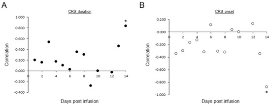 Correlation between activated morphology CAR T and CRS. In total, 166 consecutive PBSs of 26 patients were prepared and scanned on days 1–14 post CAR Ts transfusion. Activated morphology CAR T were classified manually by morphology experts. CRS severity grading was determined according to the American Society for Transplantation and Cellular Medicine (ASTCT) consensus. Correlations between CRS onset (A, black circles) or CRS duration (B, white circles) and average number of activated morphology CAR T/PBS were determined during days 1–14. * = p < 0.03 (left).