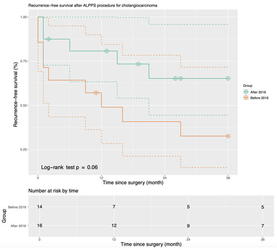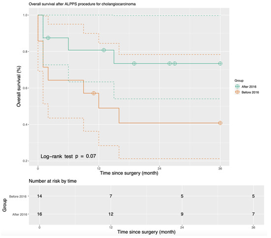 The median duration of follow-up after the ALPPS procedure was 31 months (range 0–127 months). RFS and OS both increased after we modified our ALPPS procedure in 2016. The one-year OS increased from 40.9% before 2016 to 80.8% after 2016. The three-year RFS increased from 30.7% before 2016 to 65.3% after 2016 (p = 0.06) (Figure 1), and the three-year OS increased from 40.8% before 2016 to 73.4% after 2016 (p = 0.07) (Figure 2).