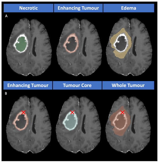 (A) The non-overlapping masks (the input for the multi-class approach) and (B) the overlapping masks (the input for the binary class and the multi-label approaches; the red cross shows an example of overlapping pixels for enhancing tumor tissue).