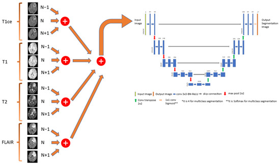 The 2.5D U-net architecture [38] employs the same 2D U-net model but enhances it to accommodate multi-channel inputs. Specifically, it utilizes a 3-channel method, where the current image, the previous image, and the following image in the volume are concatenated. This allows for the utilization of all MRI modalities as input. The application of the 3-channel method for each modality is depicted in Figure 5.