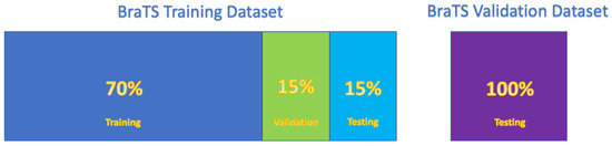 The 3D MRI of the BraTS 2021 dataset has the dimension of 240 × 240 × 155. Before the collection of the slices (240 × 240) or patches (192 × 192 × 128), the training dataset samples are split into 70% training, 15% validation, and 15% testing shown in Figure 6. The training dataset is 10% less than the state-of-the-art model [29]. Following the train/test splitting, 155 slices are collected for each patient of the 2D U-net models. The slice collection is performed with a 3-channel method for 2.5D U-net. All slices are selected with the 3-channel method (the current (N), the previous (N − 1), and the following slices (N + 1)) for each modality. The first and the last slices of a patient (when there was no slice before or after the slice) are collected with the addition of a synthetic slice of fully black pixels. In 3D U-net, a patch of 192 × 192 × 128 is collected for each patient.