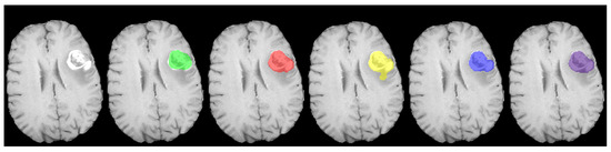 There are two representations of tumor classes: labels (non-overlapping masks) and sub-regions (overlapping masks). While the labels are classified as enhancing tumor, necrotic, and edema, the sub-regions being segmented are (i) enhancing tumor (ET), (ii) tumor core (TC; enhancing tumor and necrosis), and (iii) whole tumor (WT; enhancing tumor, necrosis, and edema) [21]. Despite this, multi-class segmentation still focuses mostly on label segmentation instead of region-based techniques. However, previous studies show that optimization based on sub-regions instead of labels achieves better results [22,23,24,25].