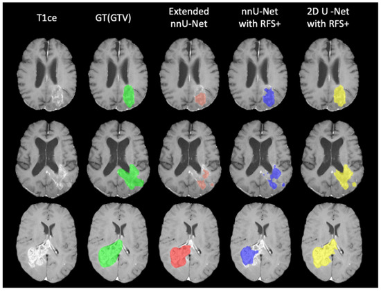 Figure 7 demonstrates the prediction of 2D U-net models with and without RFS+. Each model without RFS+ segmented the tumorous tissue differently. No single approach exhibited unequivocal superiority over the others; rather, each approach demonstrated unique advantages depending on the specific task requirements, such as TC/GTV segmentation. RFS+ yields improved segmentation by encompassing the benefits of each individual approach comprehensively.