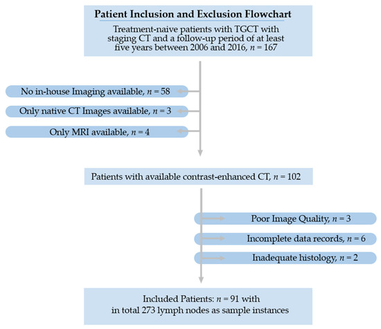 The study’s primary objective was to investigate retroperitoneal LN metastases from TGCT using clinical and imaging studies retrieved from electronic medical records. From an initial screening of 167 patients, only 91 patients met the selection criteria and were part of the final cohort. The recruitment pathway is shown in Figure 1.