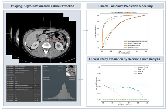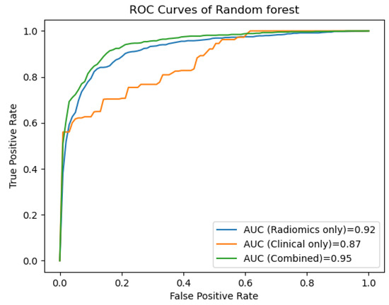 Figure 4 shows the receiver operating characteristic (ROC) curves for the clinical, the radiomics and the combined clinical–radiomics models based on Random Forest algorithms.