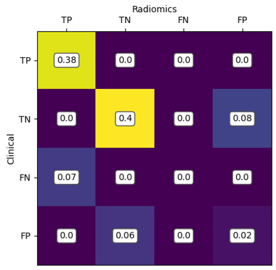 The most values are aligned along the main diagonal, indicating a high level of agreement between clinical and radiomic results. In particular, 38% are correctly classified as true positives (TP) and 40% as true negatives (TN) by both models. Both models misclassify 2% as false positive (FP). In addition, the radiomics model misclassifies 8% of cases as FP, but the clinical model correctly identifies these. In contrast, the clinical model misclassified 7% FN and 6% FP.