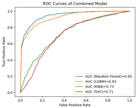 The ROC curves of the prediction models show that the combined RF-based model outperforms the LGBM-based model. In our analysis, SVC- and KNN-based prediction models performed considerably worse. LGBM = Light Gradient Boosting Machine; KNN = K-Nearest Neighbours; SVC = Support Vector Machine Classifier.