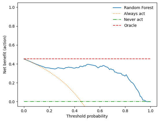The decision curve shows that when the threshold probability is between 0 and 0.89, the use of the Random Forest-based combined prediction model provides an increased benefit over treating all or none of the patients.