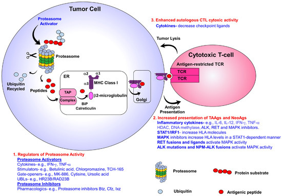 The development of immunotherapeutics focused on T-cell cytotoxic activity is a powerful tool to fight cancer. The premise for such a strategy is that the phenotypic alteration of tumor cells and repertoire of tumor-associated antigens (TAAgs) can be targeted by effectors of the host immune system. However, evasion of immunosurveillance is a hallmark of cancer that thwarts the efficacy of immunotherapeutics and reduces patient benefit [66]. Newly emerging results indicate that the successful development of antitumor immune responses is linked to T-cells that target cancer cell-specific neoepitopes. These neoepitopes are a category of peptides bound to the MHC-I and result from tumor-unique mutations. However, identifying actionable neoantigens (NeoAgs) exclusively presented on cancer cells remains a challenge [67,68,69]. Immunoproteasome upregulation is linked with improved response to treatment with immune checkpoint inhibitors (ICIs) [70,71]. These observations suggest the need for highly sophisticated proteolytic machinery with the functional plasticity to generate finely tailored products. Novel small molecules and pharmacologics that activate proteasomes represent a tractable approach to increase antigen presentation, overcome immune escape, and enhance T-cell cytotoxic activity (Figure 1).