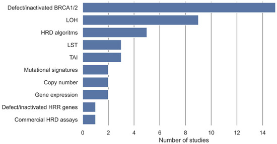 In the included studies, the definition of HRD was rather heterogeneous and lacked consensus between the studies. The definition of HRD was based on multiple measures used either alone or in combination (Figure 2), with defect BRCA1/2 and LOH being the most frequently used measures of HRD.