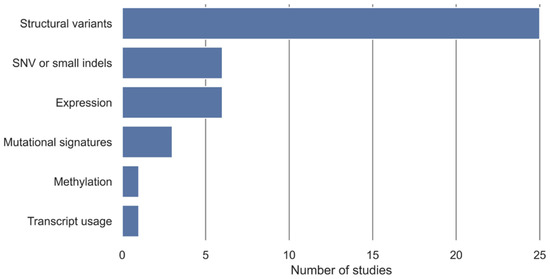In 16 studies, the development of HRD tests has been based on existing classification algorithms for classifying samples into non-HRD and HRD groups with an HRD definition used as a class label. The additional 11 studies have developed a novel classification algorithm to classify samples into non-HRD and HRD groups (Table 2). The algorithm input data have been stratified into categories, displayed in Figure 3, with structural variants being the most utilized algorithm input, followed by SNV or small indels and expression.