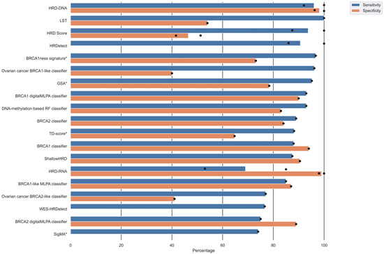 The included studies provided a variety of performance measures and validation results (Table 2) based on a study-individual gold standard of HRD. Sixteen studies reported the sensitivity of their HRD test, of which five studies reported more than one sensitivity due to multiple validations. Corresponding specificities were only reported in 13 studies, of which four provided more than one specificity. An overview of the sensitivity and specificity of the different HRD tests is displayed in Figure 4 and Table 2. The sensitivity ranged from 53% to 100%, and the specificity ranged from 40% to 100%. The HRD test with the highest sensitivity and corresponding specificity was HRD-DNA [43], followed by BRCA1-like digitalMLPA classifier [36], BRCA1 classifier [22], ShallowHRD [35], BRCA1-like MLPA classifier [23], DNA-methylation-based RF classifier [38], and BRCA2 classifier [24]. The HRD score [16], LST [7], BRCA1ness signature [29], and Ovarian cancer BRCA1-like classifier [40] had high sensitivity, but the corresponding specificities were relatively low (Figure 4). HRDetect [28] also had a high sensitivity but did not report a corresponding specificity.
