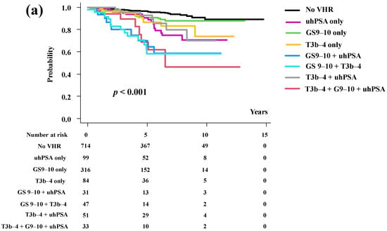 The actuarial 5-year bDFS was 96.3%, 90.9%, 90.4%, 86.5%, 58.3%, 64.6%, 92.7%, and 68.8% (p < 0.001, Figure 4a) in the No VHR, GS 9–10 only, uhPSA only, T3b–4 only, GS 9–10 + T3b–4, GS 9–10 + uhPSA, T3b–4 + uhPSA, and all three VHR (uhPSA + T3b–4 + GS 9–10) subgroups, respectively.