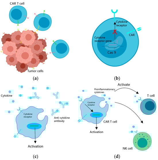 In the context of solid tumor treatment, the remodeling of the tumor microenvironment (TME) is of paramount importance. Various cytokines have been identified as inhibitors of the antitumor function of CAR T cells. Cytokines, which are broadly categorized into regulatory, pro-inflammatory, and anti-inflammatory cytokines. Among these cytokines, IL7 in the regulatory cytokines and IL12 and IL15 in the pro-inflammatory cytokines have shown promise when utilized in fourth-generation CAR T cells [63,64,65]. The cells not only secrete pro-inflammatory cytokines to enhance their direct tumor-killing activity but also promote proliferation of endogenous T cells, while protecting themselves from immunosuppressive cytokines [17] (Figure 1d).