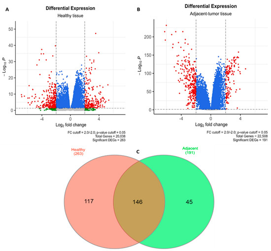 Distribution of DEGs. Volcano plots showing the distribution of DEGs found in (A) healthy and (B) adjacent tissue versus tumor tissues. Gray dots: Genes that do not fit in the FC cutoff and have p-value > 0.05; Blue dots: Genes that do not fit in the FC cutoff and have p-value < 0.05. Green dots: Genes that fit in the FC cutoff and have p-value > 0.05; Red dots: Genes that fit in the FC cutoff and have p-value < 0.05. (C) Venn diagram evidencing the number of shared DEGs between the two conditions.